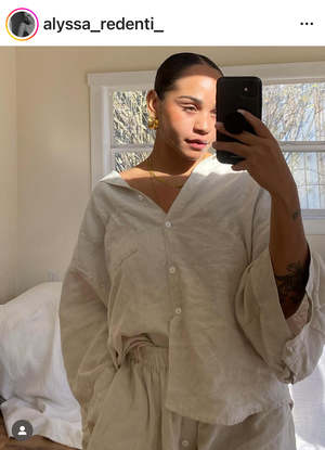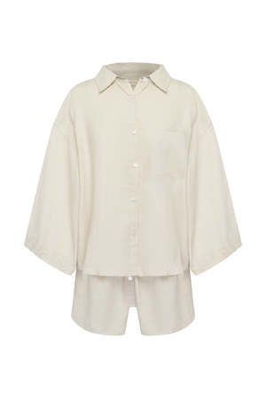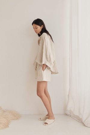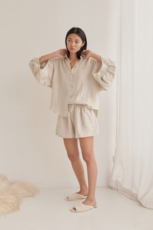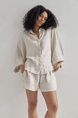 Deiji Studios as a concept is to blend morning into night, daywear into sleepwear. The designers embrace slow fashion and believe we are most confident when dressed comfortably. They are driven by social purpose and the pursuit of an innate sense of style that defies age and time. Deiji Studios uses small, family run factories and works closely with them to ensure good working conditions, fair wages and hours. Their linen is softened by natural pumice stones, all wastewater is recycled and disposed of responsibly, and scrap fabric is donated. The brand is proud to be carbon neutral and based in Byron Bay, Australia. The 03 Set features an oversized box fit linen shirt with wide arms and a front pocket. Designed to sit mid rise, the loose fitting boxer style shorts have a faux button down fly and an elastic waist for comfort. Can be worn at home, in bed, or out. - Oatmeal color - Size down if in between - Side pockets on shorts - 100% Stone washed French linen - OEKO-TEX 100 certified, GOTS certified organic and EU certified - Measurements across front - - Size XS Top (25" pit to pit, 26" length) - Size XS Shorts (12.5" unstretched - 15.5" stretched, 15" inseam) - Size S/M Top (26" pit to pit 26.5" length) - Size S/M Shorts (14" unstretched - 17.5" stretched, 15.5" inseam) - Size M/L Top (27" pit to pit, 27.5" length) - Size M/L Shorts (15" unstretched - 19" stretched, 15.75" inseam) - The model is 5'8", wearing Size S/M - Christina is 5'5", wearing Size M/L - SKU #DSC1852