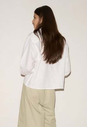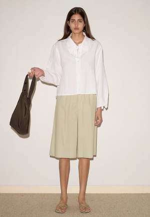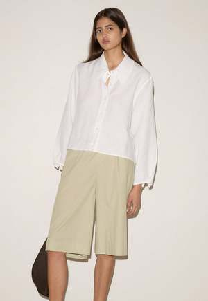 A classic crisp button up shirt in a boxy fit, featuring a dropped back yoke, dropped shoulders, and a classic shirting cuff. Composition: 100% GOTS certified organic, OEKO-TEX 100 certified and EU certified stone washed French linen. Model is 5'10" wearing a size S.