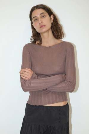 A sheer fine knit ribbed long sleeve top with soft edge finish and sectioned rib detail at the bust. Details: - Made from a responsible blend of 65% Ecovero viscose and 35% recycled polyester with OEKO-TEX 100 certification - Designed in Australia, made in China - Gentle machine wash in cold water with mild soap, line dry in shade