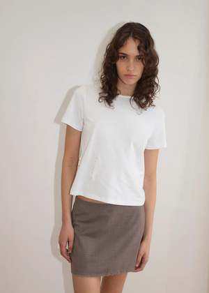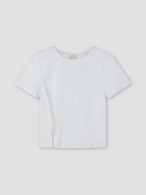 A relaxed short sleeve tee with a classic crew neckline shape finished with loose elastic and a straight-cut body, featuring a pinched side seam with contrast lilac hook and eye closures that allow the shape to be worn cinched in or left open. Color: White Made from 100% GOTS organic cotton.