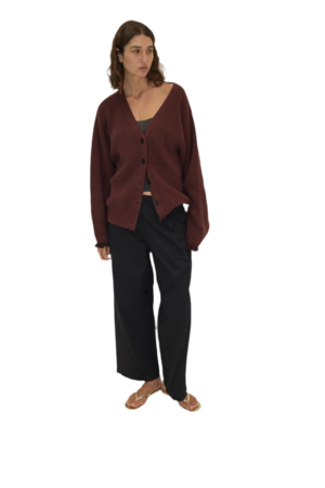 A relaxed, loose and textured cardigan features a flattering v neckline, contrast, flounce sleeve hem and button front. Made from a knit blend of 70% recycled acrylic, 15% RWS wool, 15% recycled nylon.
