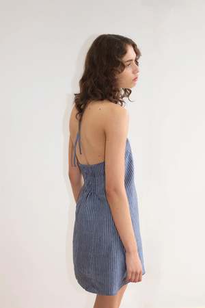 A relaxed mini dress featuring a soft cross-over halter and a frayed neckline detail in a relaxed fit. Color: Azure Stripe Made from 100% GOTS certified organic, OEKO-TEX 100 certified and EU certified stone washed French linen. Fit: True to size.