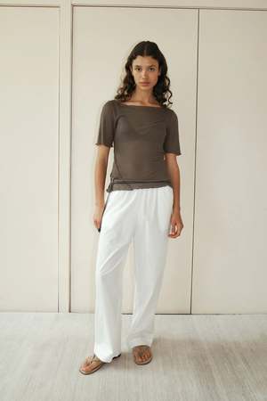 The ease trouser by Deiji Studios in white is an ankle length pant featuring a soft minimal elastic waist with side seam pockets in a straight leg. Made from GOTS certified organic cotton poplin. Sizing: XXS XS S M L XL Length 37.40 38.39 38.58 39.17 39.37 39.96 Hip 19.29 20.28 21.26 22.24 23.23 24.21 Waist 11.42 12.40 13.39 14.37 15.35 16.34 Rise 11.81 12.20 12.60 12.99 13.39 13.78
