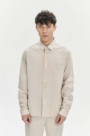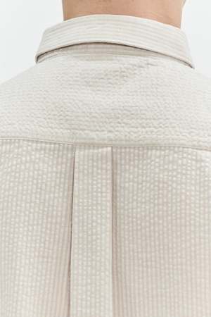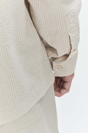 Timeless staples that you'll find yourself turning to time and time again. This beige seersucker shirt has a classic collar and is minimally detailed with a patch pocket at the chest. Leave the buttons undone and layer it over a tee for a more relaxed look. This shirt is cut from a solid seersucker. It is woven by our favourite Portuguese weavers Tecidos Somelos. The fabric features a rich handle and a pleasant weight, making it one of those garments that you want to select from your wardrobe all year around. Designers note: Finest Portuguese Fabric 100% cotton, pre washed, no shrinkage Sustainable mother-of-pearl buttons attached with a special rubber thread to prevent from falling off Model is shown wearing size M Model measures: chest 35.5"/90cm, height 6"/184cm Gentle machine washing at 40C Do not tumble dry as this destroys the fabric Size fit: True to size, long sleeve Recommend for guys up to 188cm Model is 62/189cm tall, with a 36/93cm chest and wears size M