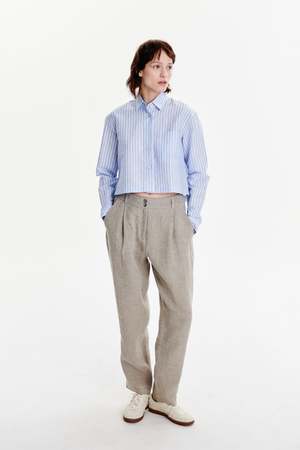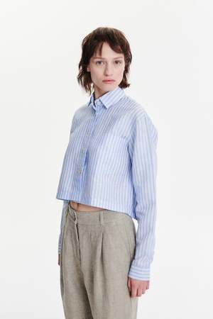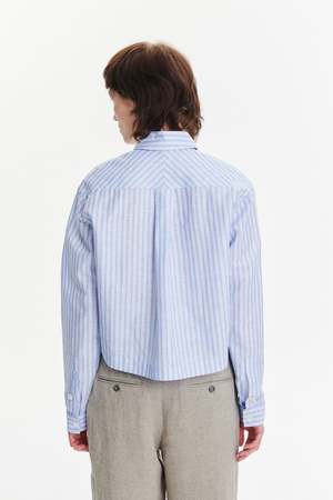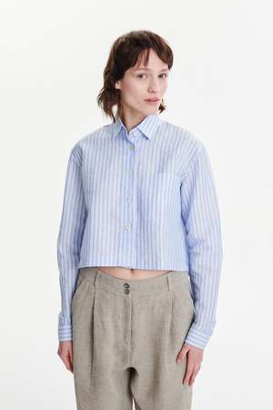 A relaxed cropped shirt in soft tonal stripes featuring a patched chest pocket and mother-of-pearl buttons. Made from 65% cotton and 35% linen. True to size, long sleeve, relaxed fit. Take your regular size. Model is wearing size S. Model measures: bust 76 cm, height 176 cm. Machine wash at 40C.