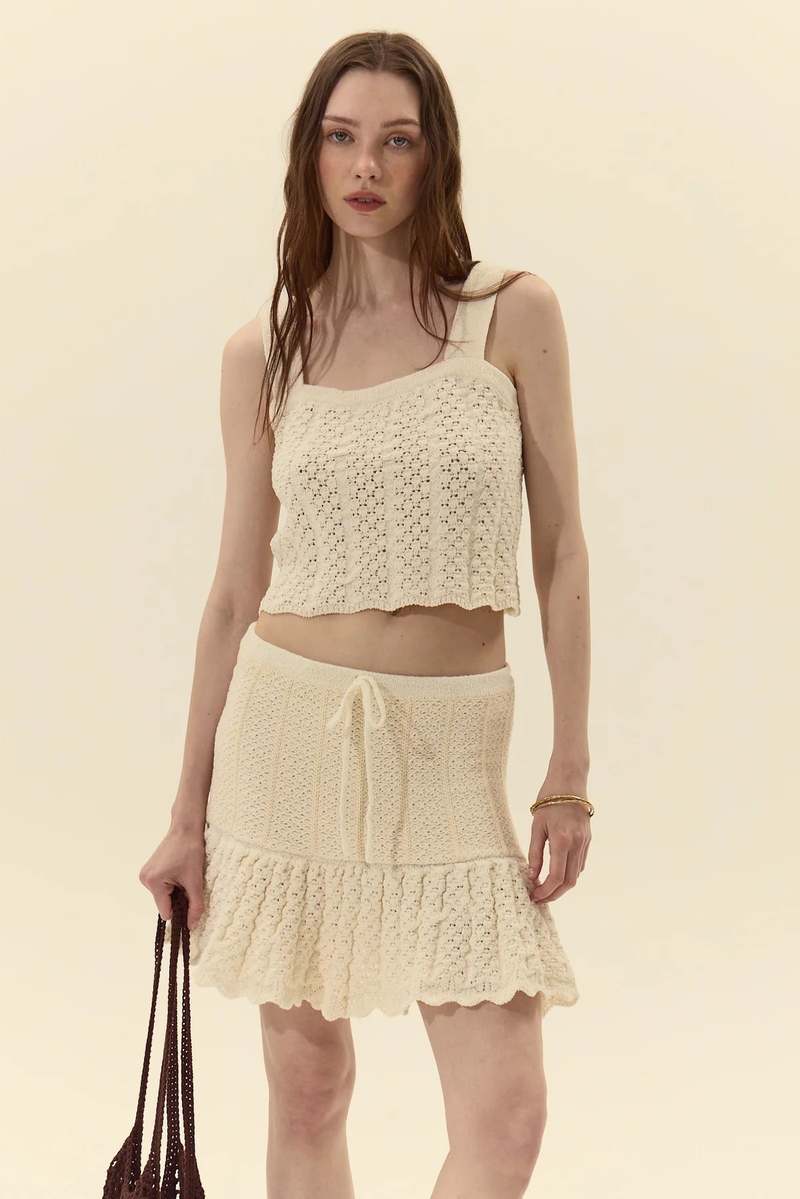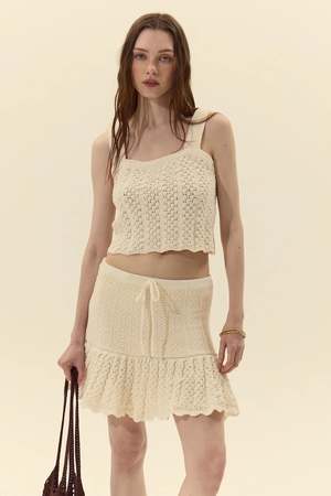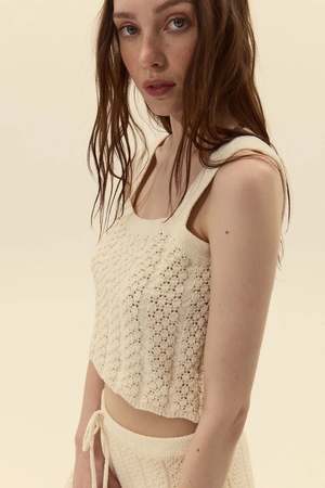 Cropped knitted sleeveless top with a square neckline and wide shoulder straps. Crafted from an open, crochet-inspired knit for texture and breathability, and finished with a subtle scalloped hem for a delicate, polished touch. Fit: true to size Model is 175cm / 5'9" wearing size S. 60% Polyester 30% Cotton 10% Spandex