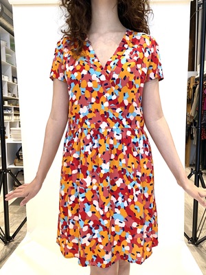 Cheery printed dress with faux-wrap style Relaxed silhouette with free waist Surplice neckline with hidden snap Short sleeves Wash cold, lay flat to dry Model is 5'6.5" and is wearing a size 0 / XS