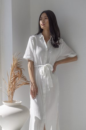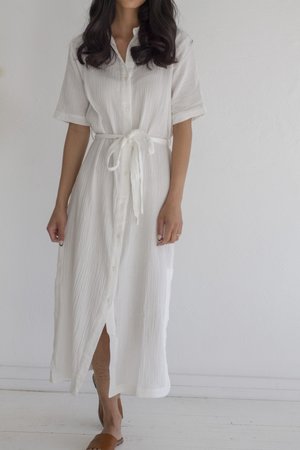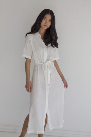Our favorite throw-on-and-go. A simple cotton gauze shirt dress featuring a tie-waist belt. - White - 100% cotton - Hand wash cold Measurements (lying flat) S - 18" bust, 18" waist, 19" hips, 4.5" shoulder, 10" sleeve, 46.5" length M - 19" bust, 19.5" waist, 21.5" hips, 5" shoulder, 11" sleeve, 47.5" length L - 21.5" bust, 21" waist, 22" hips, 5" shoulder, 11.5" sleeve, 49" length
