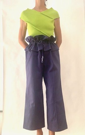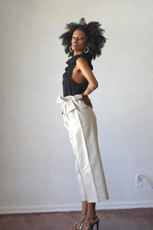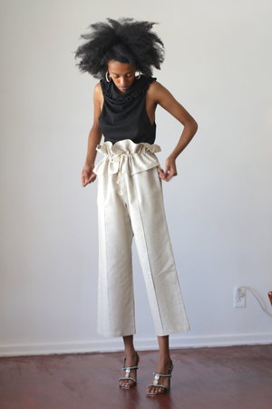 Very Cool High Paperbag waist pants. Straight leg, drawstring with metal caps on the endings. Sewn front crease, slightly cropped leg length comes in Black, Tomato and light Glitter Linen 55% Linen, 45% Cotton Made in Los Angeles Please read our return Policy & don't hesitate to ask any questions All sales are final on sale merchandise