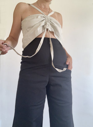 Our Classic Elevado pant now in a fitted style with side zipper High waisted, wide legged with two signature slit front pockets and two back pockets 100% Cotton Made in Los Angeles