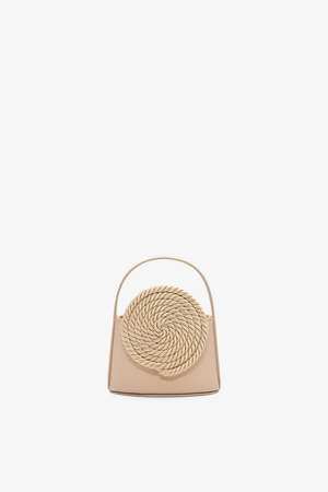 The Mini Gunther leather bag by Destree is a compact take on the Gunther Passementerie style, crafted in Spain. Its structured silhouette features a black cotton drawstring pocket and a chain strap for crossbody wear. The tone-on-tone passementerie detail adds a distinctive, geometric touch inspired by French craftsmanship. Dimensions: 16 x 13.5 x 9 cm (6.3" x 5.3" x 3.5").