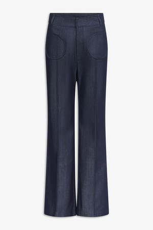 High-waisted flared trousers with circular pockets, designed to combine structure and fluid movement. Lightweight cotton-blend fabric (75% cotton, 24% polyester, 1% elastane). High-waisted fit with a structured waistband. Statement circular front pockets. Straight cut for an elongated silhouette.