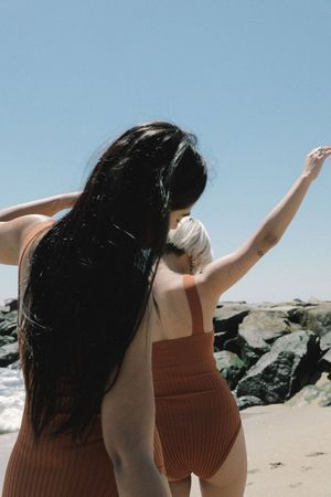 Day to Night, Land to Sea We are so happy to bring you this small run of our first water-friendly garment in collaboration with our lovely friends over at Deta! Deta creates knitted swimwear crafted from a fine gauge, water resistant yarn that dries quickly and won't lose its shape! Day to night, land to sea, the Anna One Piece will transition with ease. 90% Polyester, 10% Nylon Removeable padding Knitted in Los Angeles, California Melissas Measurements Height: 5'4" --- Bust: 32" --- Waist: 28" --- Hip: 37" --- Wearing Size S Melissa wears the Anna One Piece with jewelry by Jane D'Arensbourg