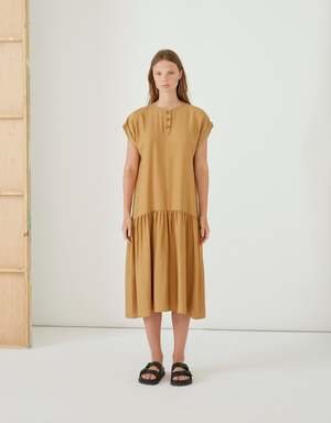 Relaxed fit dress with gathered skirt and button details. - Zero waste, timeless style and local manufacturing - 100% Viscose - Made in Spain in a local, family-run factory - Gentle machine wash. Do not tumble dry. Do not bleach. Iron at low temperature. Can be dry cleaned. - The model is 178 cm tall and wears a size S SIZE CHART XS S M L BUST (cm/inch) 84/33 88/34.5 92/36 96/37.5 SIZE (cm/inch) 66/26 70/27.5 74/29 78/30.5 HIPS (cm/inch) 92/36 96/37.5 100/39 104/41