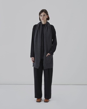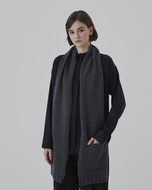 Long knitted scarf with a pocket in soft bouclette luxury Cashmere blend. Models are 177cm and 180cm and wear size S. Made in a family-run factory in Spain.