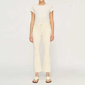 Bridget is a high-rise, cropped boot cut fit that utilizes Instasculpt technology to smooth, sculpt, and conform to your body for the perfect fit. Flax is a warm, off-white denim. It features faux front pockets, a brushed silver shank and matte copper rivets, tonal stitching, a raw hem, and an ecru back patch. Rise: 10 Inseam: 27 Leg Opening: 17.25 This style has high stretch and runs true to size. Model is 5'10" and wearing size 25.