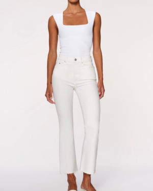 The DL1961 "Bridget" Bootcut Instasculpt Jeans in White Denim combine style and innovation for the perfect fit. Crafted with Instasculpt technology, these jeans smooth and shape your silhouette, offering a flattering, sculpted look that conforms to your body. The high-rise, cropped cut and raw hem give them a modern, on-trend vibe, while the fitted design through the hip and thigh ensures a sleek, tailored fit. With a classic five-pocket style, button/zip fly, and belt loops, these jeans are the ultimate blend of comfort, style, and versatility. Approximate 27" inseam. Care guide: Cotton/elasterell-p/Lycra spandex. Machine wash cold.