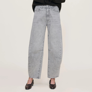 Miro is a high-rise, true barrel leg jean that is fitted at the hip with a 28" inseam, tapering at the leg. Storm Cloud is a washed light grey denim with authentic character. It features silver hardware, tonal stitching, a clean hem, and an ecru back patch. - Rise: 12" - Inseam: 28" - Leg Opening: 15.5" - This style has no stretch and runs true to size. - George is 5'9" and wearing size 25. - 80% Cotton, 20% Recycled Cotton Our family-owned facilities have partnered with Recover to produce certified and traceable recycled fiber fabrications, transforming textile waste into sustainable fibers to further our commitment to the environment and closing the loop on fashion.
