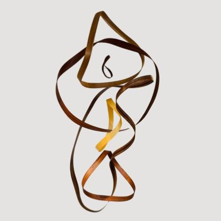 Don Jereb's kinetic ceiling-hung mobiles are unique, utilizing random intertwined strips of hardwoods that are twisted and formed into Mobius loops. Each wood strip is steam bent into a random form, then intertwined with other loops to create a visually enticing mobile. 38"W x 60"T Materials: Zebra wood, Ash, Mahogany, Alaskan Yellow Cedar Made in Northern California.