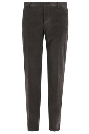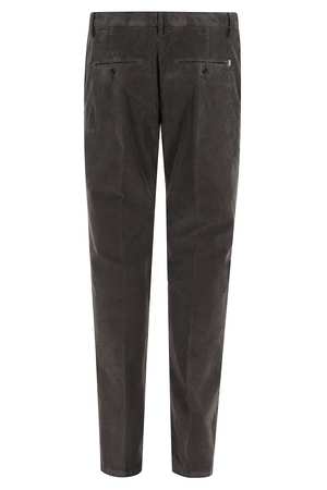 Dark brown pants with Spirit pattern. Features ribbed texture, two side welt pockets, two back button pockets, waist loops, and front button and zipper closure.