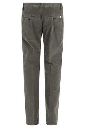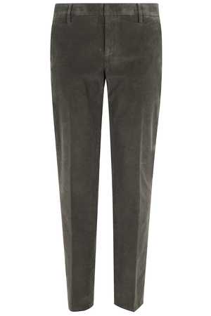 Pants by Dondup in military green with a Spirit pattern. Features ribbed knit, two side welt pockets, two back button pockets, waist loops, and front button and zipper closure.
