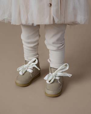 The Wisi Organza Toddler Shoes are the perfect companion for outdoor adventures, offering just the right support for those first steps. The flexible outsole with a slightly elevated heel provides enhanced support. The adjustable organza laces ensure a snug fit around the ankle, while the reinforced structure, particularly around the heel, provides the necessary support and stability for your little one's growing feet. Made from 100% premium leather. Quality Lining: 100% Sheep wool. Upper: 100% Leather. Laces: 100% Cotton. Outsole: 100% Rubber. Made in Indonesia.