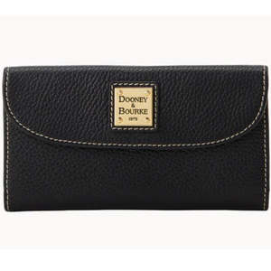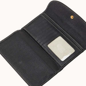 - Snap closure. - H 3.75" x D .75" x L 7". - Designed in Norwalk, CT by Peter Dooney. - One outside zip pocket. - One inside pocket. - License pocket with window. - Two bill compartments. - Eight credit card slots. - Lined.