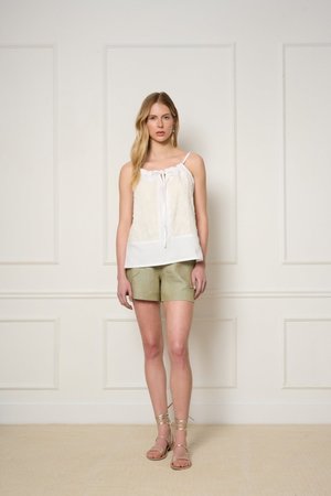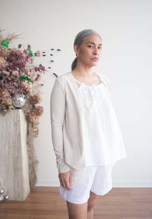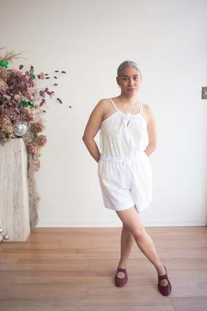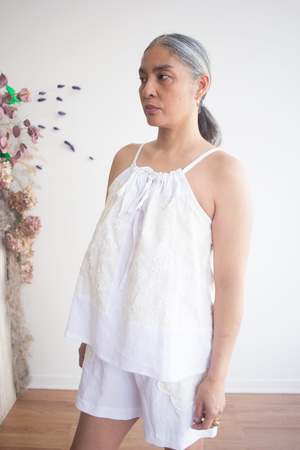 The Stellaire Cami by DorsaLi is a beautifully crafted linen tank featuring a gorgeous array of cotton lace applique and embroidery. Made from a heavyweight linen and lace, the Stellaire is designed for effortless style and versatility, making it the perfect companion for both city strolls and tropical getaways. This cami is fully lined and features adjustable drawstring shoulder straps and side slits. Pair with the matching shorts for a sweet summer set! Sizing Notes: This cami fits true to size. We recommend ordering your usual size. Please see below for exact garment measurements. XS-S: Bust 102 cm (40"), Length 60cm (24") M-L: Bust 106 cm (42"), Length 62cm (24 1/2") XL-XXL: Bust 112 cm (44"), Length 64cm (25") Body: 100% Linen (European Flax) Appliqu: 100% Cotton Lace Embroidery: 100% Polyester Lining: 100% Cotton Voile Wash inside out with cold water, lay flat to dry. Press or steam with medium heat if needed. Fabric is Pre-Washed. Made in Montreal, QC.