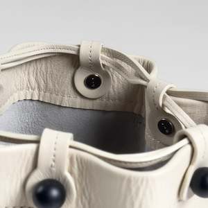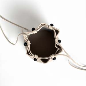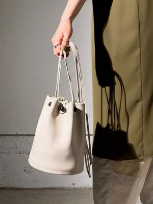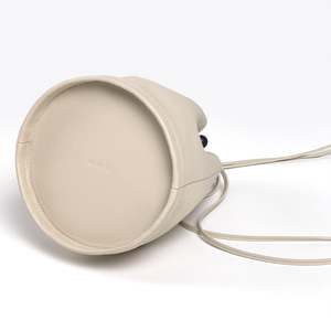Detail Crossbody / shoulder bucket bag Premium smooth grain Italian aniline leather, matte finish Cow suede lining Nickel-plated satin black solid metal sphere nuts Nickel-plated bolts, and strap toggles with logo2 detail Leather strap with center stitchings Dimension 7 * 8.7 * 7, Strap drop max 24.4 (inch) 180 * 220 * 180, Strap drop max 620 (mm)