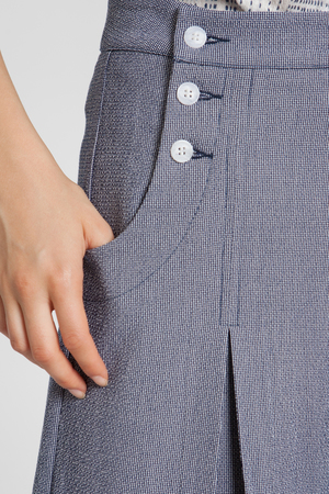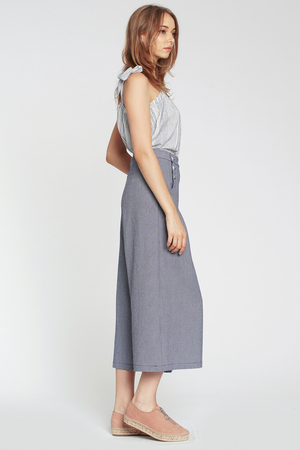 Nico pant is sailor inspired made modern. A structured crepe woven with a touch of stretch for fit gives the traditionally casual style a level of sophistication. High-waisted and slightly cropped. Box pleats at the front seams and 2 rows of buttons at the front flap closure. Side pockets. Stretch fit. Color: Provence gingham. Material: 85% Polyester, 12% Rayon, 3% Spandex. Hand wash cold. Model is wearing size S.