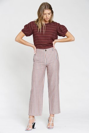 The Adela pants feature a nostalgia stripe, midrise waistline, and front and back welt pocket detail. - 100% Cotton - Woven stripe pattern - Machine wash cold - Mid-rise - Button fly - Straight leg - Model is wearing size Small.