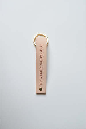 Handmade leather keychains finished with brass hardware.