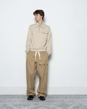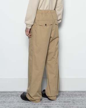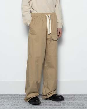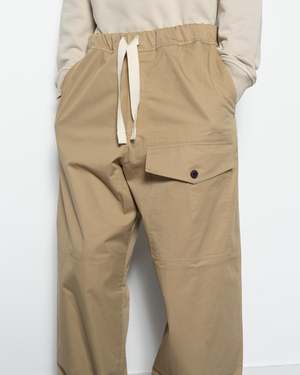 Dries Van Noten Pannoch Pants in Beige. The Pannoch Pants are a pair of relaxed cargo pants crafted from cotton poplin. Set in a loose-fit, high-waist construction, the pair features an elastic waistband with an integrated drawstring. Complete with a zip fly, and a spacious flap pocket at the left thigh, side and back pockets.