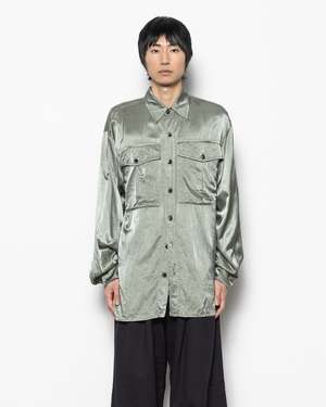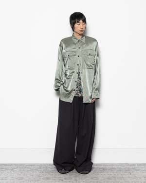 Dries Van Noten Calendo Shirt in Mint. A relaxed button-up shirt with an oversized design, made from a smooth viscose blend. It features two breast pockets, each with a flap and button closure. The buttons are a smoky grey and are used for the front closure, pocket flaps, and cuffs. This glossy shirt has dropped shoulders, ideal for layering. - 62% Viscose, 38% Cotton. - Made in Italy. - Cold wash and line dry. - 261-020710-3277. Alex is 60" (183 cm) and is wearing a size S.