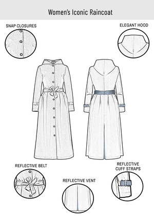 Details The Womens Iconic Raincoat is made with a waterproof, windproof, and breathable recycled polyester outer shell and a soft recycled lining inside. The raincoat is recognizable by its reflective details: vent in the back, belt, and cuff straps. The raincoat is lightweight (1.2 kg). Size The model in the picture is 171 cm tall and she is wearing size XS. Seam-sealed waterproof 10,000 mm water column pressure. Content + Care Designed and made in Vilnius, Lithuania. We ship worldwide. 2% of this purchase will be dedicated to supporting wild ducks and their habitat. Shell 90 % recycled polyester, 10 % polyurethane elastomer; detailing reflective material; lining 45 % viscose, 55 % recycled polyester. Due to monitor differences, the actual colors of raincoats may vary slightly from what appears online. The product should be hand-washed when needed. If using a washing machine in hand-wash mode, select low spin speed. A small amount of dirt can be easily cleaned using a damp cloth and soap (optional). Ironing temperature (shell) max 110C. Do not iron parts made of reflective material. The product can be dry cleaned. The product can be tumble-dried using low heat. Do not bleach.