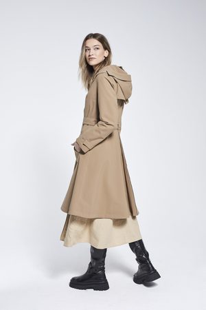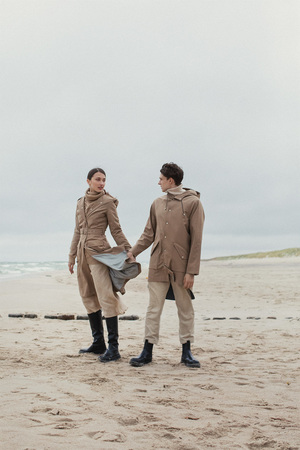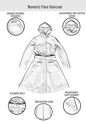 The Womens Flare Raincoat is made with a waterproof, windproof and breathable recycled polyester outer shell and a soft recycled lining inside. The raincoat features a reflective vent in the back, back storm flap and the hood with an adjustable reflective front flap. The raincoat is lightweight (1 kg). Seam sealed waterproof 10,000 mm water column pressure. The model in the picture is 179 cm tall and she is wearing size M. Designed and made in Vilnius, Lithuania. We ship worldwide. By purchasing our items you are contributing 2% of your order to saving wild ducks and their habitat in Lithuania and we are so thankful for that! MATERIAL Shell 100 % recycled polyester; detailing reflective material; lining 45 % viscose, 55 % recycled polyester. CARE The product should be hand-washed when needed. If using a washing machine in hand-wash mode, select low spin speed. A small amount of dirt can be easily cleaned using a damp cloth and soap (optional). Ironing temperature (shell) max 110C. Do not iron parts made of reflective material. The product can be dry cleaned. The product can be tumble dried using low heat. Do not bleach. *Due to monitor differences, actual colors of raincoats may vary slightly from what appears online.