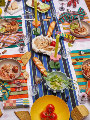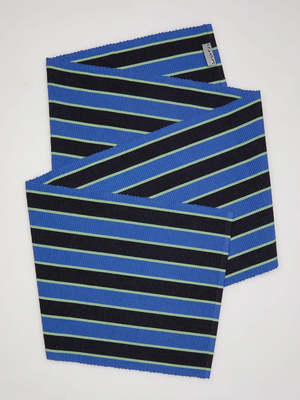 Table Runner in navy, black and sage Pistachio Stripe by Dusen Dusen. Cotton runner in tri-color stripes with a ribbed texture. 100% cotton, 12" x 72". Machine wash cold and lay flat to dry. Spot clean as needed. Made in India.