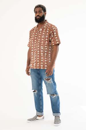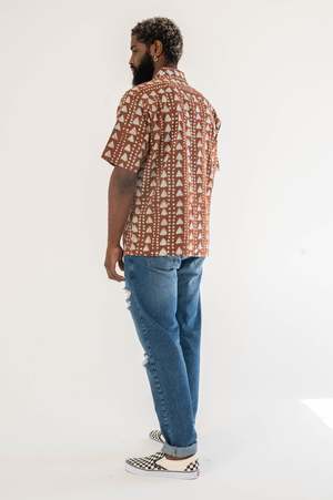 Fit and Style Notes: - REGULAR fit with flat hem - Camp collar shirt. This fit is our ode to the 1950s style camp collar shirts - Left chest pocket - Get your normal size for a regular fitting look David is 6'1", weighs 170 pounds and is wearing size M Fabric Details: - Natural dyes. Naturally extracted dyes were used to print this fabric! - Color: Brown Abstract Art Print - Fabric: 100% Ultra-soft Hand Block-Printed Cotton - The fabric is entirely HAND BLOCK-PRINTED using traditional wax block-printing techniques. Inconsistencies in the print are a feature of the hand-printed nature of the fabric. Sizing (in inches): - Small - Shoulder: 17.75, Chest: 42, Shirt Length: 28 - Medium - Shoulder: 18.25, Chest: 44, Shirt Length: 28.75 - Large - Shoulder: 19, Chest: 46, Shirt Length: 29.5 - Extra-Large - Shoulder: 19.75, Chest: 48, Shirt Length: 30.25 Care Instructions: - FIRST WASH: For the first 2-3 washes, please wash this shirt by hand, or separately by itself. This is hand-dyed and will bleed color. - WASH: After the first 2-3 washes, you can machine wash the shirt in cold water with like colors. - DRY: Please hang dry or line dry the shirt. Please do not use the dryer. - IRON: Warm iron, as needed. Due to the labor intensive nature of the hand block-printing process, our shirts are made in small batches, and never mass produced. NOTE: The actual color of the shirt may differ from the pictures due to computer lighting and hand-made nature of the fabric.