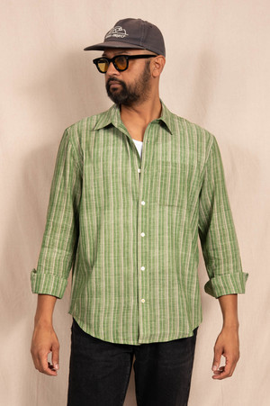 FITTING: - Regular fit long-sleeve shirt with room for movement and all-day comfort. - Dushyant (pictured) is 6'1" tall, weighs 180 pounds and wears size L. - Left chest pocket. - Get your normal size. FABRIC: - Color: Green and white stripes. - Fabric: 100% cotton handloom fabric, woven by hand on a wooden loom. SIZING (in inches): - Small Shoulder: 18.5, Chest: 42, Sleeve: 24.5, Shirt Length: 29.5 - Medium Shoulder: 19.5, Chest: 45, Sleeve: 25.25, Shirt Length: 30.25 - Large Shoulder: 20, Chest: 48, Sleeve: 26, Shirt Length: 31 - Extra-Large Shoulder: 20.75, Chest: 51, Sleeve: 26.5, Shirt Length: 31.5 CARE: - Wash: Machine wash in cold water with like colors. - Dry: Hang dry or line dry. Do not use the dryer. - Iron: Warm iron as needed. Our shirts are made in small batches and never mass produced. NOTE: The actual color of the shirt may differ from the pictures due to computer lighting and the hand-made nature of the fabric.