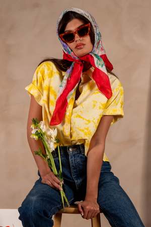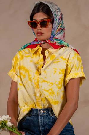 Fabric and Fit Details: - Boxy Short Sleeve Shirt - Color: Yellow and White Tie Dye - Fabric: 100% Cotton - The fabric is entirely hand dyed using traditional techniques. Inconsistencies in the print are a feature of the hand-printed nature of the fabric. Sizing (in inches): - Extra-Small - Shoulder: 16, Chest: 42, Shirt Length: 21 - Small - Shoulder: 16.5, Chest: 44, Shirt Length: 21.5 - Medium - Shoulder: 17, Chest: 46, Shirt Length: 22 - Large - Shoulder: 17.5, Chest: 48, Shirt Length: 22.5 Due to the labor intensive nature of the hand-dyeing process, our shirts are made in small batches, and never mass produced. NOTE: The actual color of the shirt may differ from the pictures due to computer lighting and hand-made nature of the fabric.