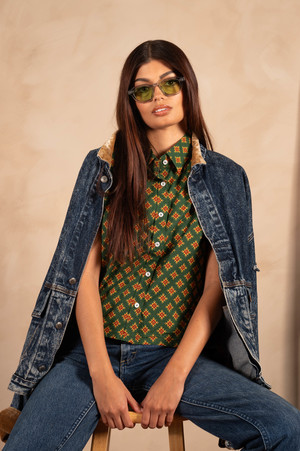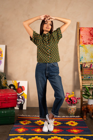 Fabric and Fit Details: - Boxy Short Sleeve Shirt - Color: Green, Gold and Red Motif Print - Fabric: 100% Cotton - The fabric is entirely hand printed using traditional hand printing techniques. Inconsistencies in the print are a feature of the hand-printed nature of the fabric Sizing (in inches): - Extra-Small - Shoulder: 16, Chest: 42, Shirt Length: 21 - Small - Shoulder: 16.5, Chest: 44, Shirt Length: 21.5 - Medium - Shoulder: 17, Chest: 46, Shirt Length: 22 - Large - Shoulder: 17.5, Chest: 48, Shirt Length: 22.5 Due to the labor intensive nature of the hand-printing process, our shirts are made in small batches, and never mass produced. NOTE: The actual color of the shirt may differ from the pictures due to computer lighting and hand-made nature of the fabric.