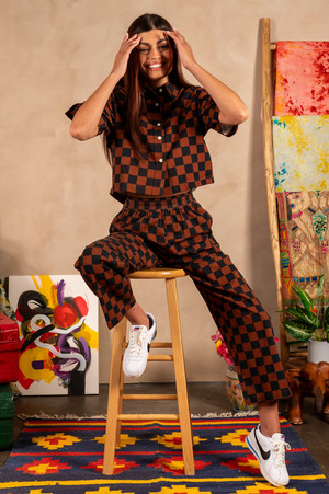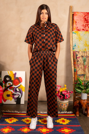 Fit Details: Please refer to the sizing chart below for details. Garment Details: - Elastic Waist Pants - Color: Chocolate and Black Chessboard Print - Fabric: 100% Cotton Twill - The fabric is entirely hand printed in Jaipur, India using traditional hand printing techniques. Inconsistencies in the print are a feature of the hand-printed nature of the fabric. Sizing (in inches): - Extra-Small - Waist (rested): 24.5, Waist (stretched): 40, Hip: 40, Pant Length: 37.5 - Small - Waist (rested): 26, Waist (stretched): 41.5, Hip: 42, Pant Length: 38 - Medium - Waist (rested): 27.5, Waist (stretched): 43, Hip: 44, Pant Length: 38.5 - Large - Waist (rested): 29, Waist (stretched): 44.5, Hip: 46, Pant Length: 39 Due to the labor intensive nature of the hand-printing process, our garments are made in small batches, and never mass produced. NOTE: The actual color of the garment may differ from the pictures due to computer lighting and hand-made nature of the fabric.