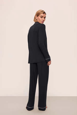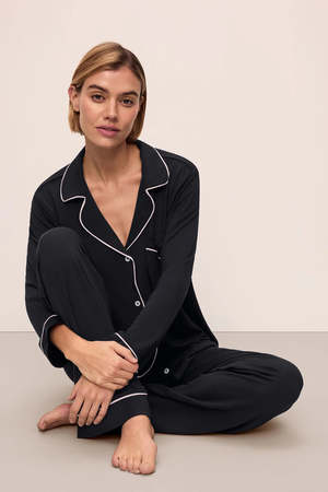 The PJ that started it all. Made from TENCEL Modal fibers and a touch of elastane, this buttery soft fabric is verified by OEKO-TEX Standard 100, meaning it's dyed with safe and non-toxic dyes. This relaxed long sleeve set features contrast piping, a button-front top with a notch collar and functional pocket, and a low-rise straight leg pant with a thin elastic waistband. Fabric: 95% TENCEL Modal, 5% Spandex Machine wash cold; tumble dry low Model is 5'7" and wears size XS. Inseam: XS-L 30 1/2" Top length from high point of shoulder: XS: 25 1/2", S: 26", M: 26 1/2", L: 27" Front Pant Rise: XS: 8 1/8", S: 8 5/8", M: 9 1/8", L: 9 5/8".
