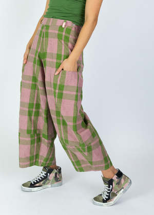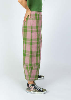 Echappes Belles' Mario Pant features a side zip closure and a wide leg. Details - Sits on waist. Side zip closure and button. - Cropped cut. Set-on waistband and belt loops. - Wide oval shaped leg that tapers towards the bottom hem. - Hand wash or dry clean. Cool iron. - Made in Romania. Color rose. 66% linen, 34% cotton. Model is 5'9", weighs 128 pounds and wears a US size 6.