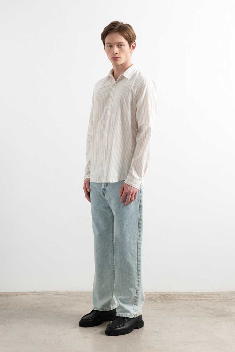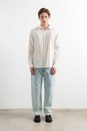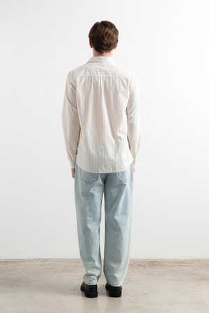 Relaxed-fit, five-pocket light-wash jeans. Features a vegan leather label on the back waistband with the "Edmmond Studios" logo2 and a decorative label on the back right pocket, plus a print on the inside pocket lining. Made and dyed in Portugal. The model is 6'1" and is wearing size L. Materials: 100% organic cotton. Fit: True to size.