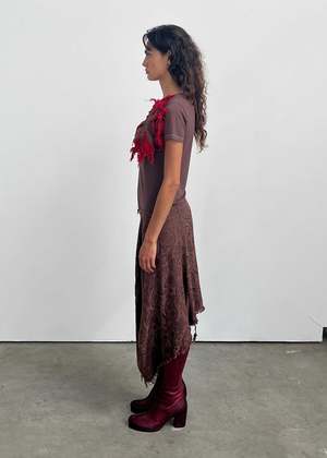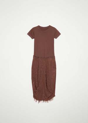 This dress combines a slim fit tee in soft jersey with contrast-stitched details and a draped, floral jacquard skirt featuring frayed edges at the hip and an asymmetric hem. The entire piece is dyed for its washed brown color. Body 1: 100% cotton. Body 2: 100% viscose. Model is 5ft 8" and wears size 2.