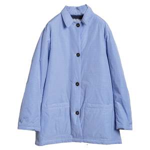 This puff coat in padded technical fabric features an all-over blue check, a soft navy cotton lining, and is finished with a short collar, welt pockets at the side, and a neat button-up front. Made by Eleph. CONTENT & CARE: 55% Polyester | 45% Cotton