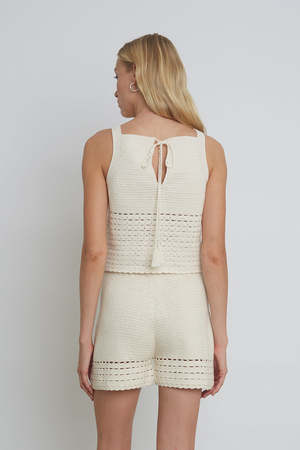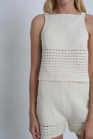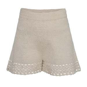 The Lara is a polished, hand-crocheted, pull-on short perfect for a Spring head-to-toe pairing. Style back to the matching Terra Tank for a knit-set. Also available in Ivory + Navy Nautical Stripe FREE DOMESTIC GROUND SHIPPING OVER $300 DETAIL: - Sustainably hand made in Peru with LOVE - Made from Peruvian yarn: 100% cotton - Crocheted stitch with open crochet stitch at bottom - Double encasing soft elastic for easy pull-on - Dry clean only SIZING: - Waist width at top approx 13" ((half on the flat) - Inseam length 2 1/2" - Leg opening 12 1/2" for ease - Model is wearing size: XS/S - Model is size S, size 2 and 5ft 10 in height - Measurements are based on size S and taken on the flat