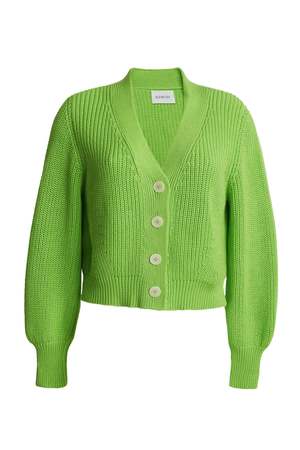 The Isla Cardi is a polished cotton version of our favorite fall staple, the Sara Cardi. With a feminine, subtle blouson sleeve, a slightly cropped body proportion, and a minimal four-button closure, you can wear it alone with your favorite high-waisted pants or as an open topper, making you feel both elegant yet relaxed. The fisherman rib stitch in sleek mercerized cotton yarn conveys an effortless yet transitional sensibility in this must-have lime color. This product is FINAL SALE. DETAILS: - Sustainably made in Peru with love - Made from Peruvian yarn: 100% mercerized cotton - Medium weight fisherman rib stitch on a relaxed body - Feminine set-in shoulders and slightly blouson sleeve into skinny rib trim at cuffs - Clean placket with four bold Italian button closure - Dry clean only SIZING: - Body length (top shoulder to bottom): approximately 19" - Body width at chest throughout: approximately 18" - Body width at bottom hem: approximately 15" - Model is wearing size XS/S - Model is size S, size 24 and 5'10" in height - Measurements are based on size XS/S and taken on the flat