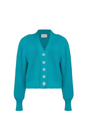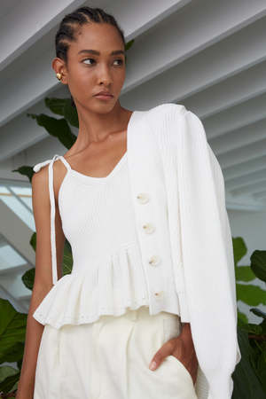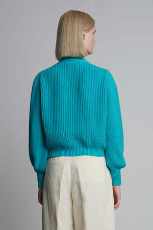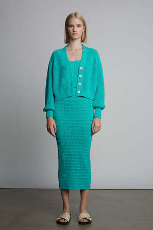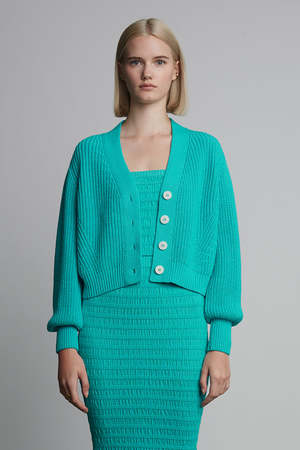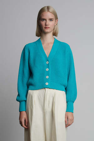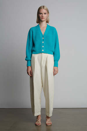 The Isla Cardi is a polished, cotton version of our favorite Fall staple: Sara Cardi. With a feminine, subtle, blouson-sleeve, a slightly cropped body-proportion, and minimal four button closure, you can wear alone or back to your favorite on-the-waist pants or as an open-topper, making you feel both elegant, yet relaxed. The classic fisherman rib-stitch in sleek mercerized cotton yarn conveys an effortless yet transitional sensibility. DETAIL: - Sustainably made in Peru with LOVE - Made from Peruvian yarn: 100% Mercerized Cotton - Medium weight fisherman rib stitch on a relaxed body - Feminine set in shoulders and slightly blouson sleeve into skinny rib trim at cuffs - Clean placket with four bold, Italian button closure - Dry clean only SIZING: - Body length (top shoulder to bottom): approximately 19 " - Body width at chest|waist|bottom hem: approximately 18 - Body width at bottom hem approximately 15 - Model is wearing size: XS/S - Model is size S, size 2-4 and 5ft 10 in height